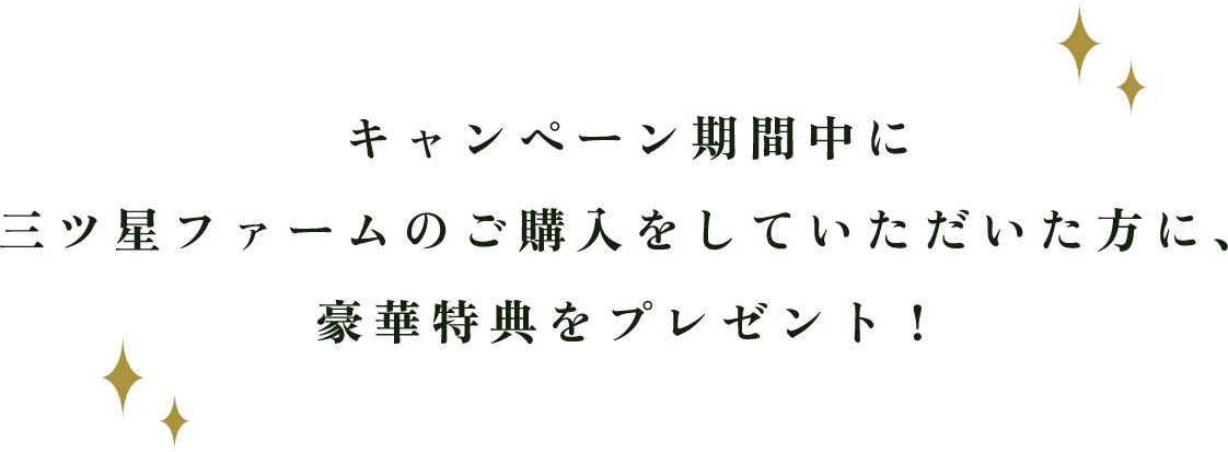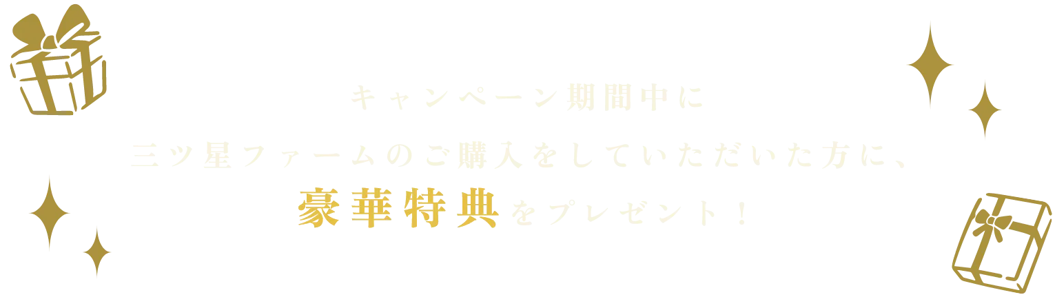 キャンペーン期間中に、三ツ星ファームを初めて購入された方全員が、初回購入特典をお受け取り可能となるキャンペーンです。